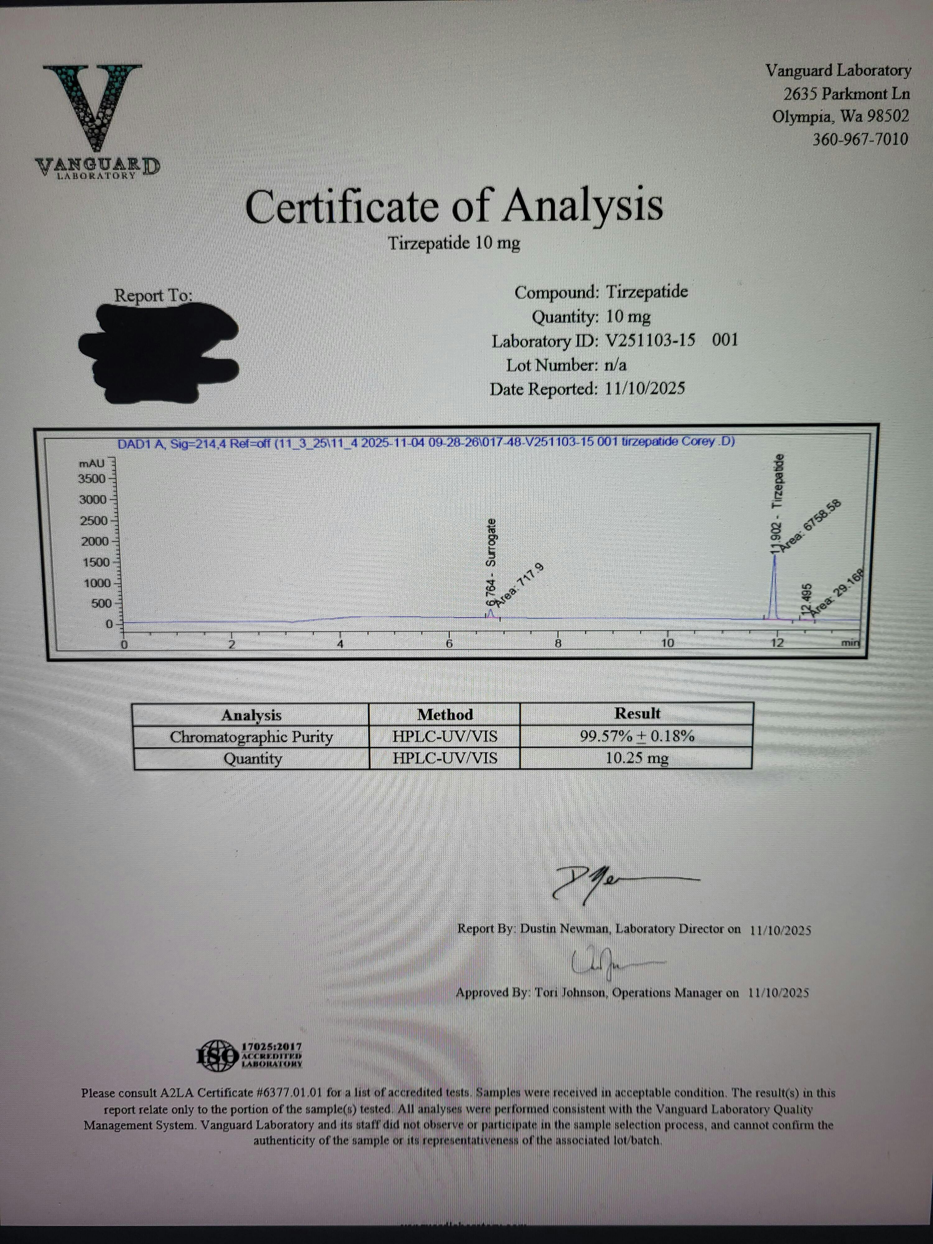 Just got back my third party testing on the Tirzepatide. It's the real deal and its 99.57 % pure. No heavy metals and is sterile. Cost me a chunk of change to test but I wanted to know I was dealing with a straight shooter. And that's what your dealing with when you do business with Bulk Peptide Supply. Will buy again and again. Thank you